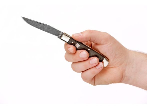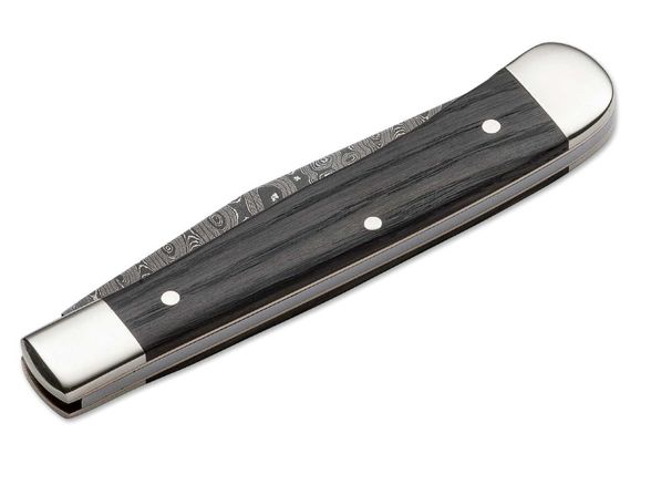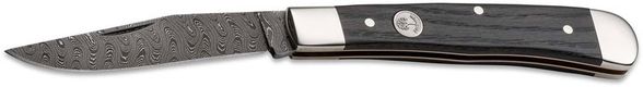 Складной нож Boker Trapper Classic Damast 112545DAM, дамасская сталь, рукоять дерево - ограниченный 500 экземплярами карманный нож Boker Trapper Classic станет легким дополнением к любому карману или коллекции. Полированное лезвие клип-пойнт из дамаска с отверстием для ногтей достаточно велико, чтобы справиться с некоторыми крупными задачами, оставаясь при этом удобным для ношения в кармане. Деревянные рукоятки из болотного дуба глубокого коричневого цвета с выраженной зернистостью и инкрустированным медальоном Boker. Полированные никель-серебряные больстеры со штифтовой конструкцией гарантируют многолетнее использование.