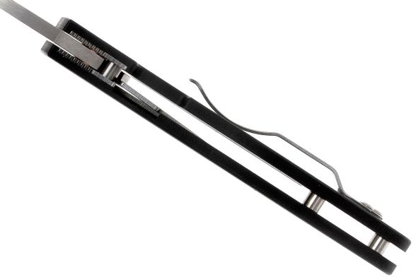 Рукоять выполнена из легкого, цепкого и прочного материала G10. Это пропитанное в эпоксидной смоле стекловолокно черного или другого цвета. Но версия Black имеет особый интерес и выглядит привлекательнее. Традиционно она сборная и состоит из двух пластин, скрепленных вместе маленькими винтами.