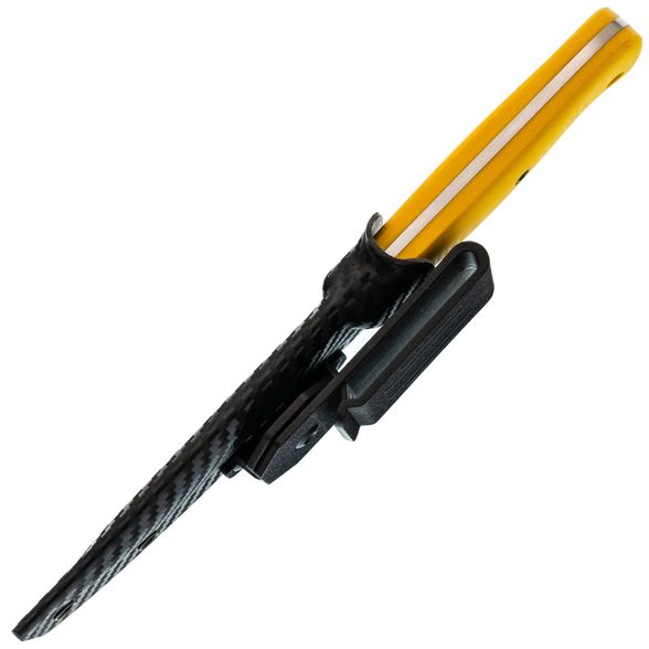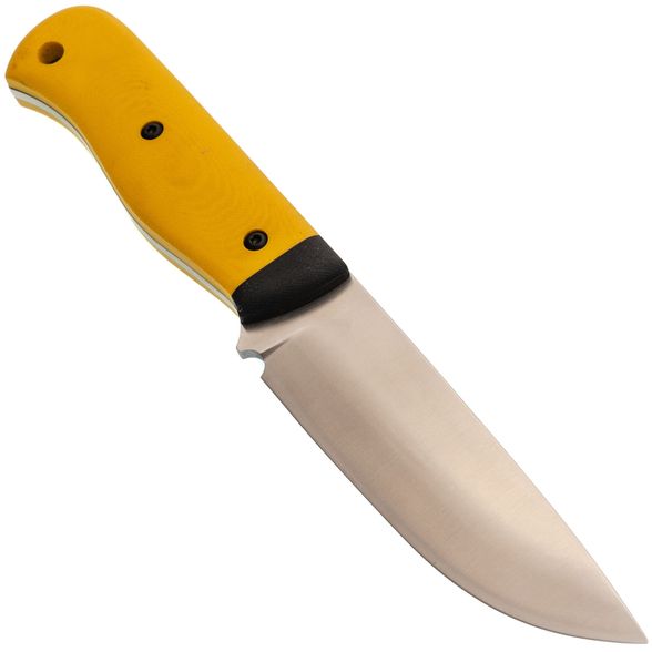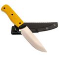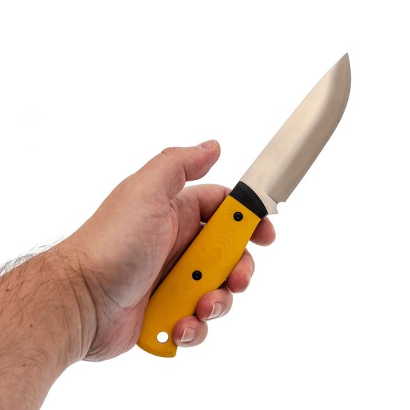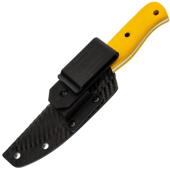 - Рукоять ножа ярко-желтого цвета, заметного даже в тёмное время суток, выполнена из прочного G10, который обеспечивает уверенный захват, не скользит в руке и выдерживает любые нагрузки. Ножны из Kydex также гарантируют, что нож всегда будет на своём месте, независимо от того, куда вы его положите.