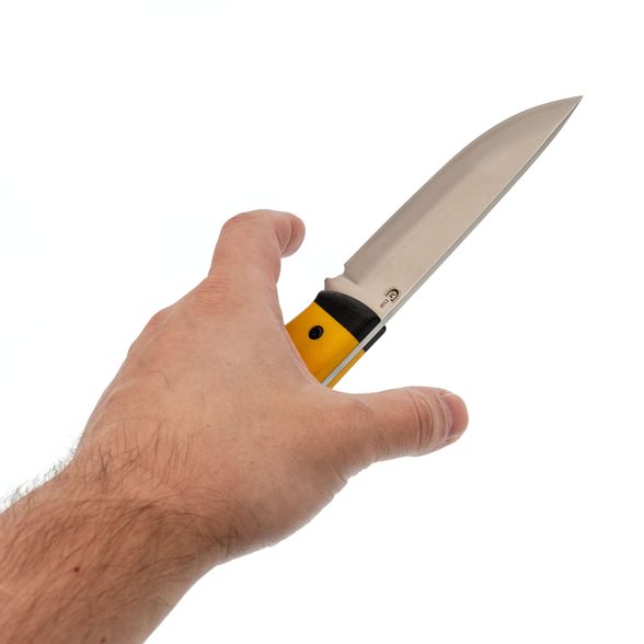 Яркая рукоять желтого цвета не только выглядит эффектно, но и делает нож легко заметным, если он случайно выпадет из рук. Удобная форма рукояти хорошо заполняет руку, создавая ощущение уверенности при работе с ножом.