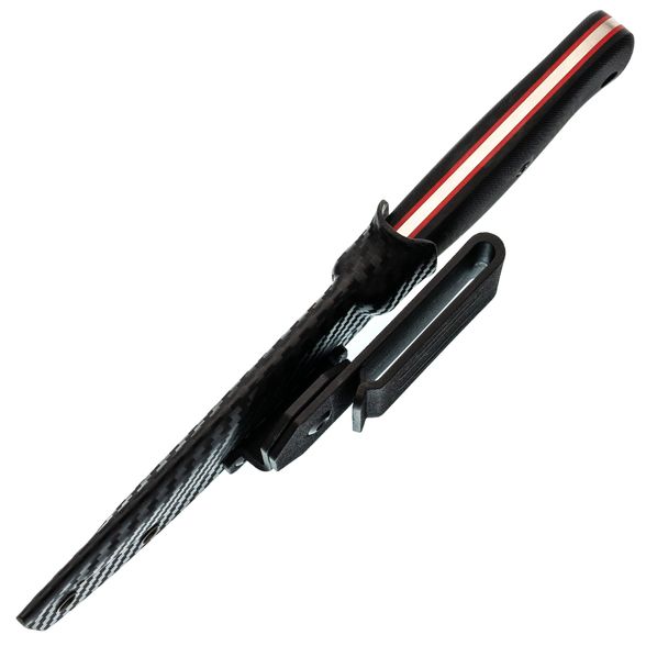 Ножны из Kydex надёжно фиксируют нож, предотвращая его выпадение, даже если носить его рукоятью вниз. Пластиковая клипса позволяет зафиксировать нож на ремне, чтобы всегда иметь его под рукой.