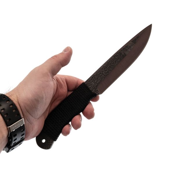 Рукоять удобно обмотана синтетическим шнуром, обеспечивая надежный и комфортный хват. Простая, но выверенная форма ножа делает его универсальным для любой техники метания и хвата.