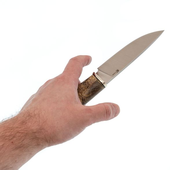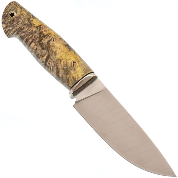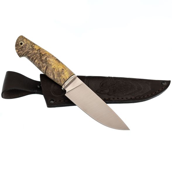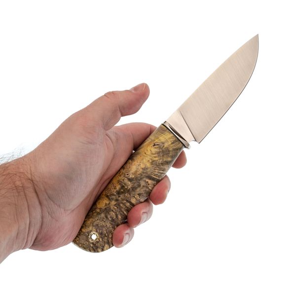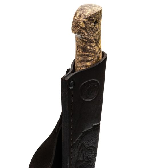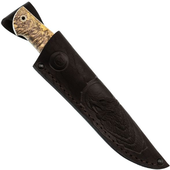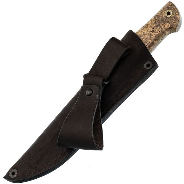 Рукоять изготовлена из стабилизированного капа клёна. «Кап» – это натуральный кусок древесины, обработанный для повышения устойчивости к влаге и механическим воздействиям. После стабилизации материал не боится воды и обладает высокой прочностью, что позволяет рукояти выдерживать суровые походные условия. Эргономичная изогнутая форма обеспечивает комфортное использование ножа даже при длительной работе.
