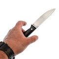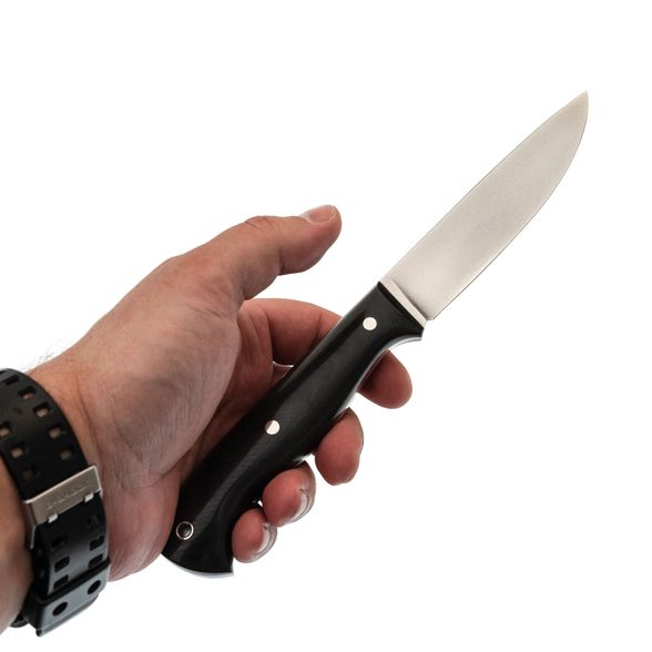 Рукоять выполнена по технологии Full-Tang, что обеспечивает ножу высокую надёжность. Накладки выполнены из стеклотекстолита G10 - это прочный синтетический материал, который не боится воды, мороза и прочих условий окружающей среды, слов подходящий для туристических ножей материал. Объёмная форма накладок отлично заполняет руку, позволяя долго работать ножом без неприятных ощущений.