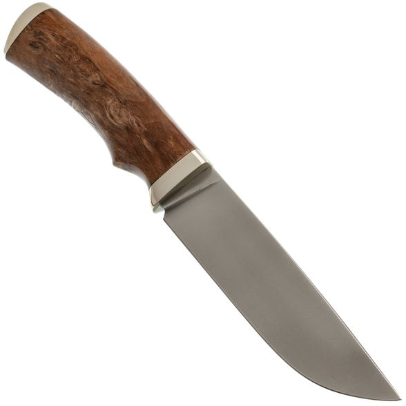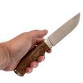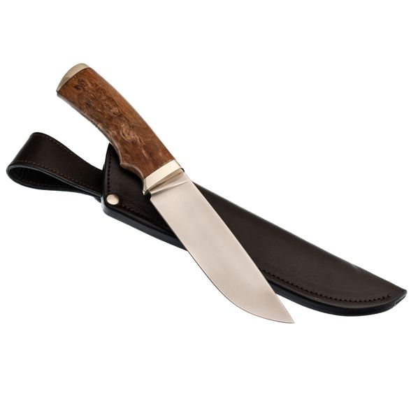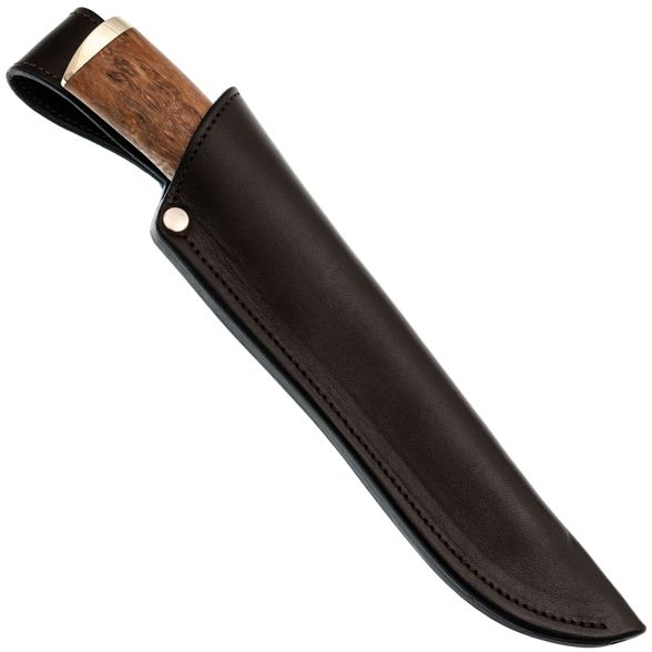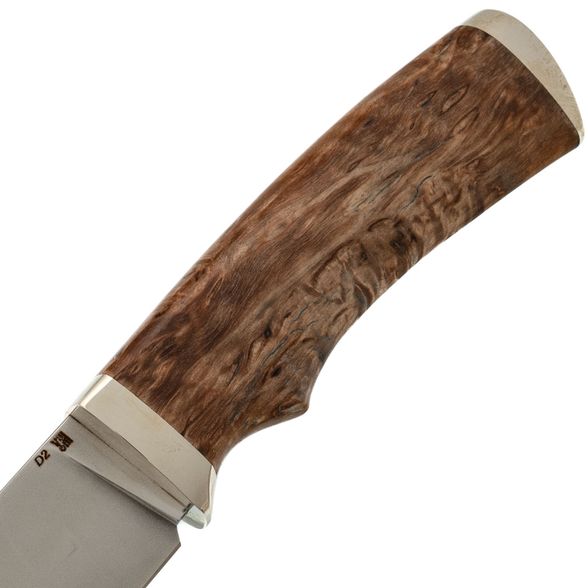 Особое внимание уделено эргономике: рукоять ножа выполнена из стабилизированной карельской берёзы, которая сохраняет свою структуру даже при длительном воздействии влаги или перепадов температуры.