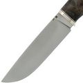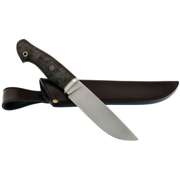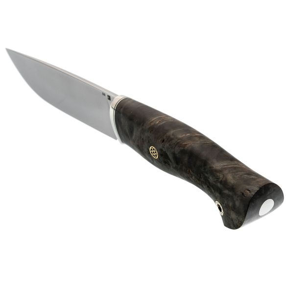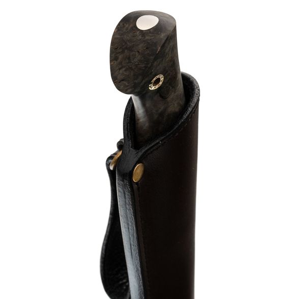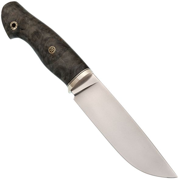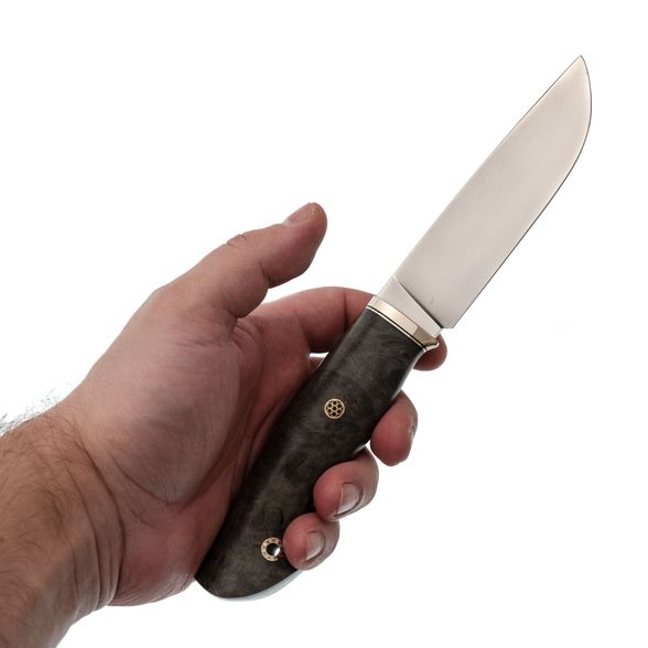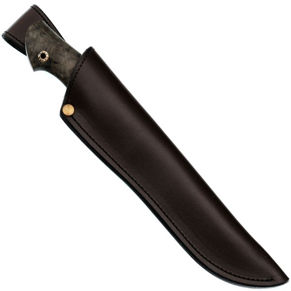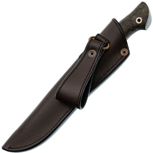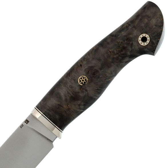 Рукоять из стабилизированного капа карельской берёзы - это не только эстетичный выбор, но и практичное решение. Стабилизация материала придает рукояти уникальный рисунок и повышает прочность, а также обеспечивает влагостойкость и устойчивость к температурным изменениям. Эргономичная форма обеспечивает комфортную и надежную хватку, позволяя работать с ножом длительное время без усталости. Всадной сквозной монтаж рукояти гарантирует надежность и прочность конструкции.