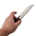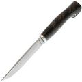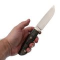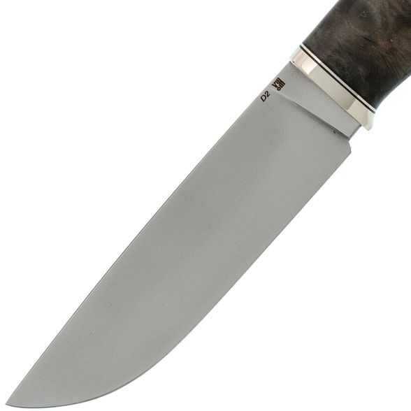 Клинок изготовлен из стали D2, которая известна своей высокой стойкостью к износу. Термообработка от Ульдановых обеспечивает отличную заточку и ее долгое удержание, что критически важно для охотничьего ножа. Форма клинка классическая, с прямым обухом и высокими прямыми спусками, что гарантирует отличные режущие характеристики.