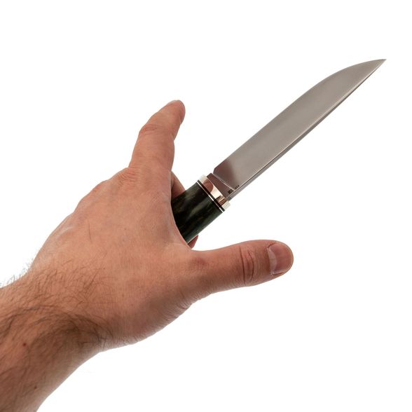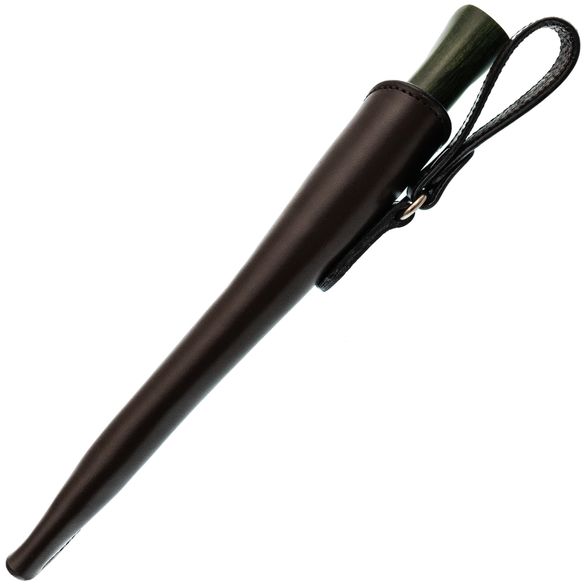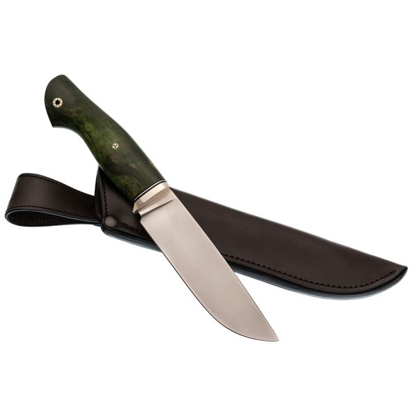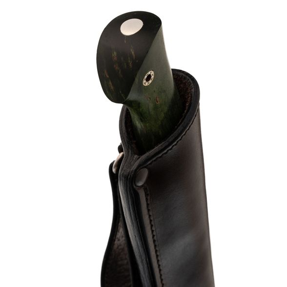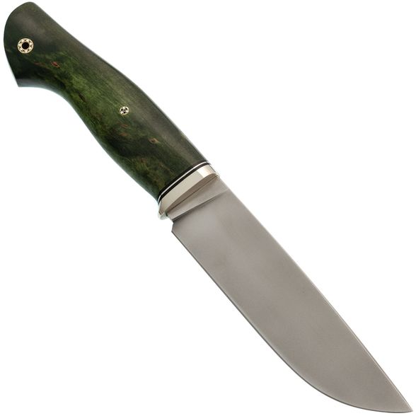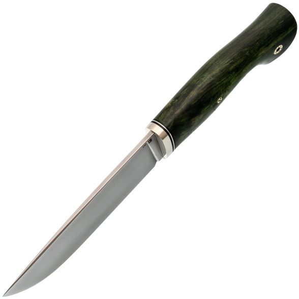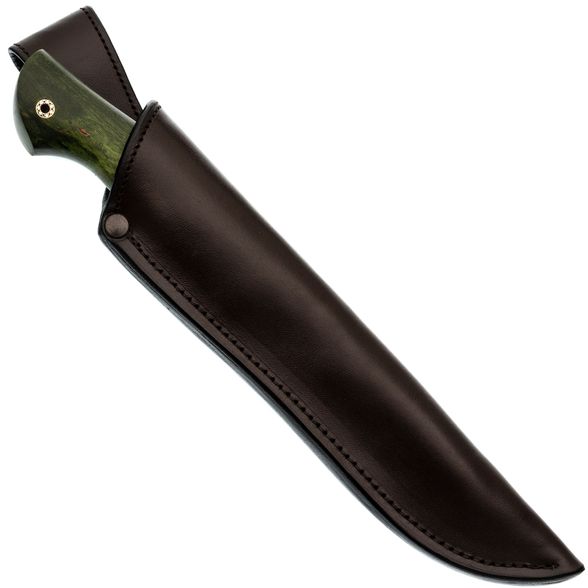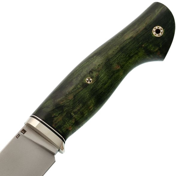 Рукоять изготовлена из стабилизированной карельской берёзы насыщенного зелёного оттенка. Каждое изделие уникально благодаря натуральному рисунку древесины. Стабилизация повышает стойкость материала к влаге и механическим нагрузкам.