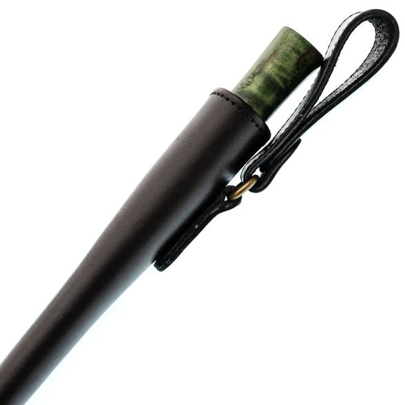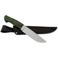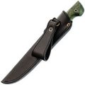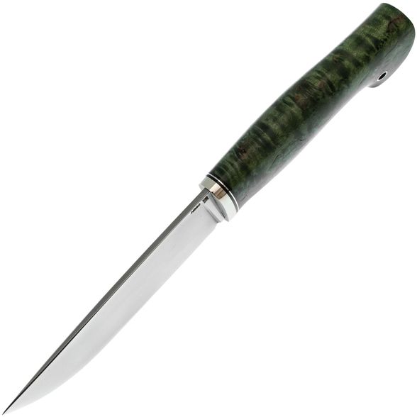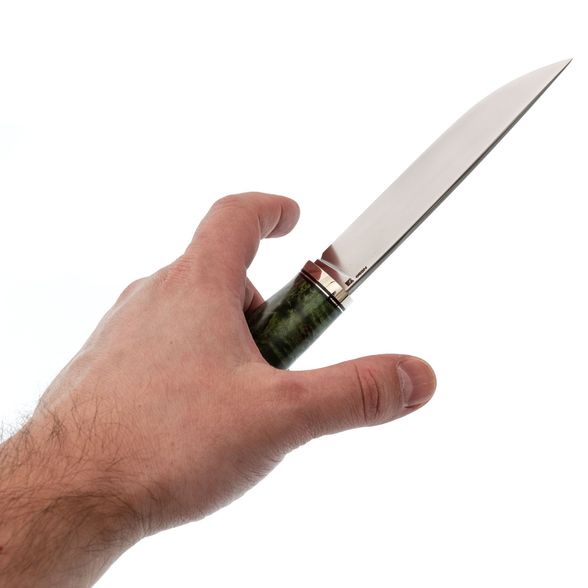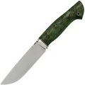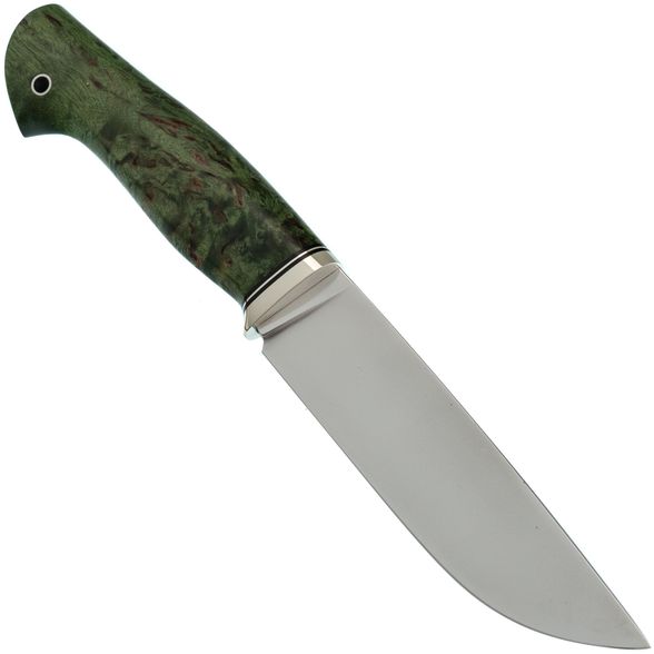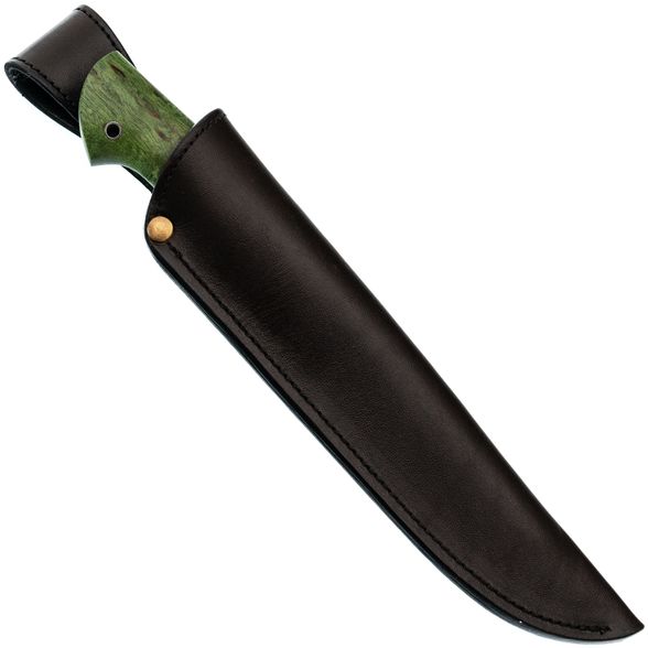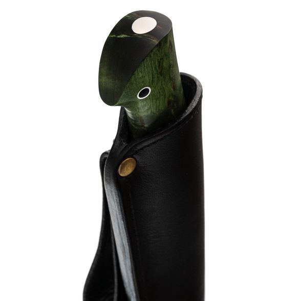 Рукоять ножа изготовлена из зелёной стабилизированной карельской берёзы, что обеспечивает ей не только прочность и неприхотливость в уходе, но и уникальный природный узор древесины, который будет отличаться для каждого экземпляра. Эргономичная форма рукояти идеально ложится в руку, позволяя использовать нож длительное время без каких-либо болевых ощущений. Такой дизайн гарантирует уверенный и комфортный хват, даже при длительной работе в полевых условиях.