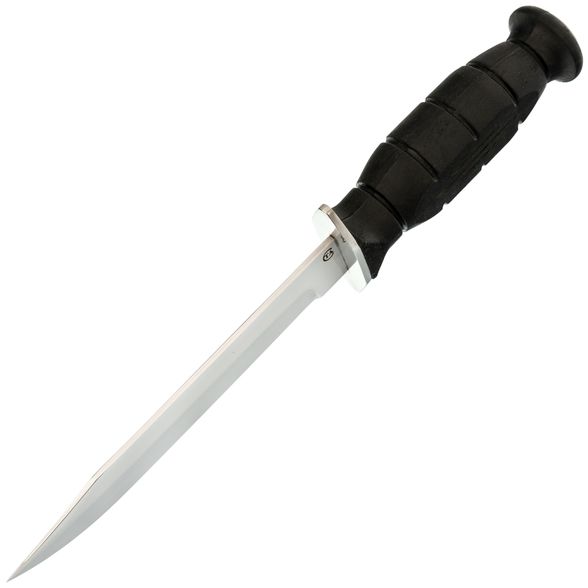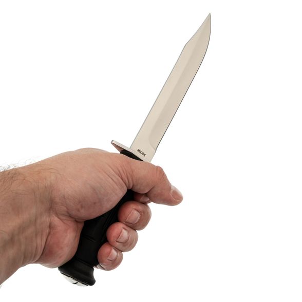 Рукоять, изготовленная из резины, легкая и водонепроницаемая, обеспечивает комфортный и надежный хват. Она идеально заполняет руку, обеспечивая максимальный контроль и предотвращая скольжение. Развитая гарда служит дополнительной защитой, не позволяя руке соскальзывать на режущую кромку даже в самых сложных условиях.