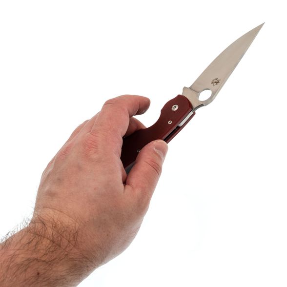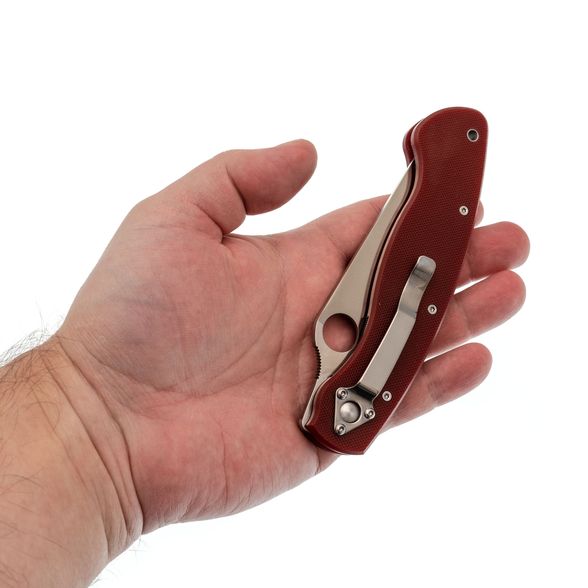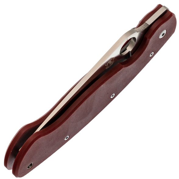 Рукоять выполнена из стеклотекстолита G10 – материала, обладающего высокой прочностью, лёгкостью и устойчивостью к внешним воздействиям, таким как запахи, выцветание и гниение. Благодаря своей эргономичной форме, рукоять удобно ложится в руку при любом хвате. Модель оснащена замком Liner-Lock, что обеспечивает дополнительную надёжность. В осевом узле предусмотрены шайбы, способствующие устойчивости ножа к загрязнениям, а наличие темлячного отверстия позволяет любителям кастомизации настроить нож под свои предпочтения.