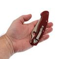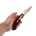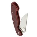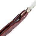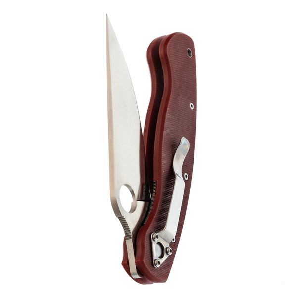 Клинок изготовлен из стали D2, известной своей исключительной износостойкостью, сравнимой с дорогими премиальными сталями. Такой материал обеспечивает долгий срок службы, сохраняя идеальную остроту даже при интенсивном использовании. Клинок имеет геометрию тройной клин, которая оптимизирует его для разнообразных задач, а прямые спуски от обуха способствуют безупречному резанию и строганию. Открытие клинка осуществляется с помощью круглого отверстия. Следует учитывать, что геометрия не предназначена для грубых ковырятельных работ, но деликатный кончик превосходно протыкает разрезаемые материалы.