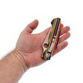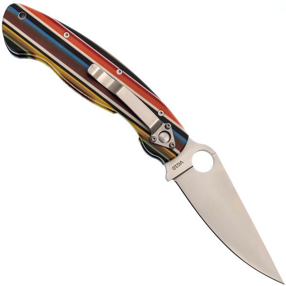 Клинок изготовлен VG-10 – нержавеющей стали, которая долго удерживает остроту и эффективно сопротивляется коррозии, оставаясь одной из лучших в своём ценовом сегменте. Изделие имеет геометрию тройной клин, что обеспечивает универсальность для различных задач, а прямые спуски от обуха гарантируют отличное режущее действие. Для удобного открытия предусмотрено круглое отверстие в клинке. Следует отметить, что данная геометрия не предназначена для грубых ковырятельных работ, зато деликатный кончик отлично протыкает разрезаемые материалы.