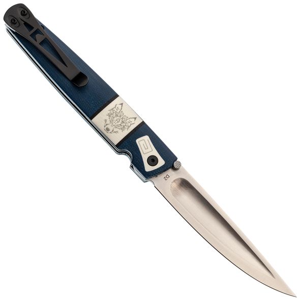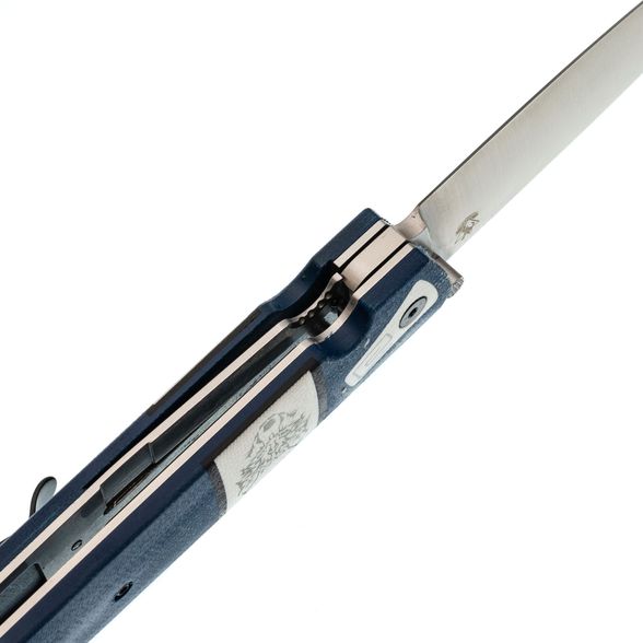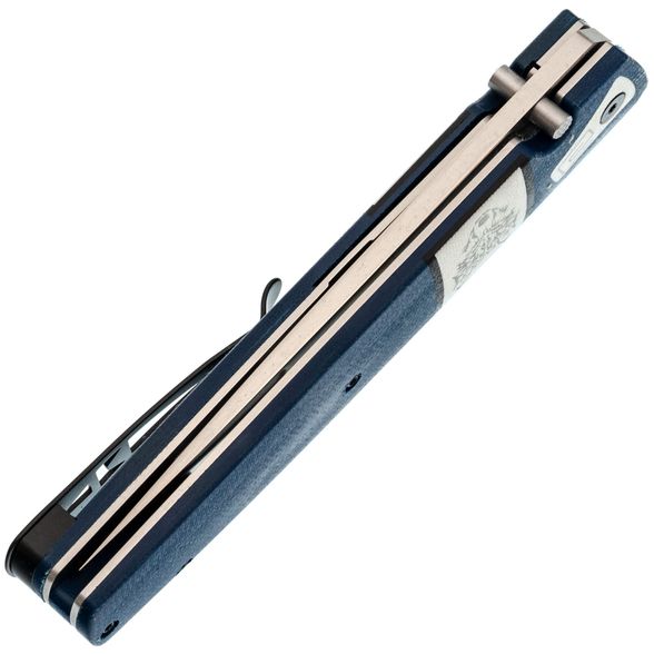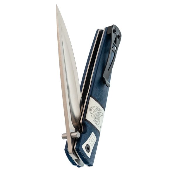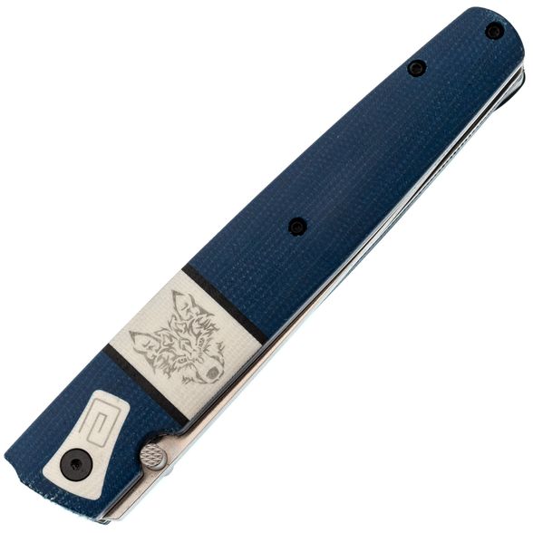 Рукоять изготовлена из стеклотекстолита G10, что обеспечивает оптимальное сочетание прочности и легкости, а также делает уход за ней простым. В этом исполнении рукоять украшена изысканной декоративной вставкой с изображением волка, придающей ножу особую динамичность и характер. Завершают образ надёжный замок Liner-Lock – самый популярный выбор для складных ножей, и клипса глубокой посадки, позволяющая удобно носить нож в кармане.