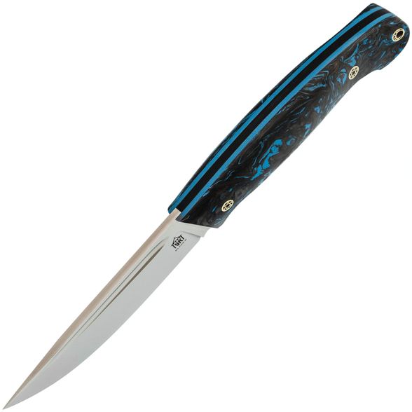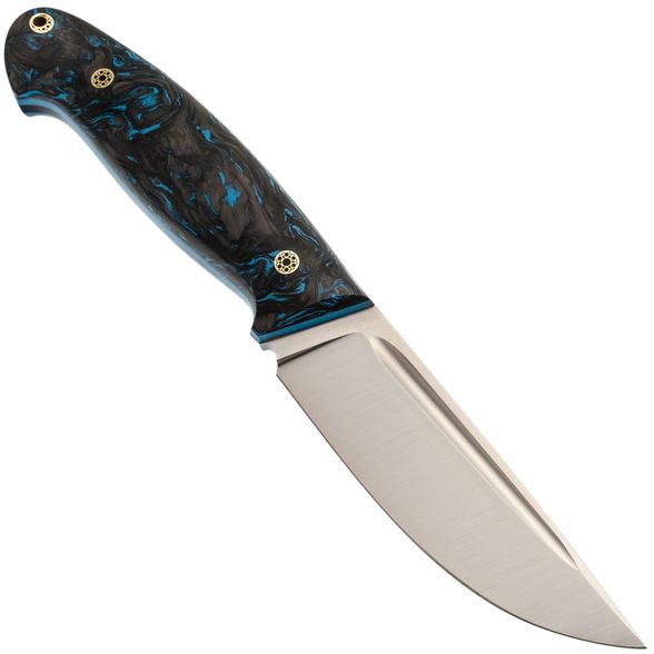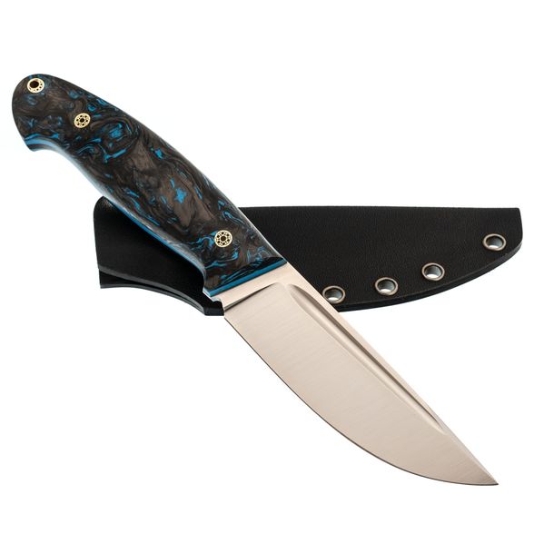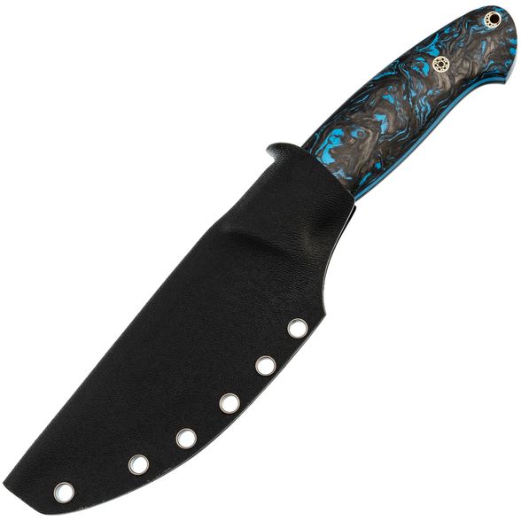 Рукоять изготовлена из карбона с проставками из G10, что обеспечивает идеальное сочетание прочности и легкости. Монтаж ножа комбинированный: накладки крепятся на полный хвостовик и закрываются проставками, предотвращая охлаждение рукояти и обеспечивая визуальную аккуратность.