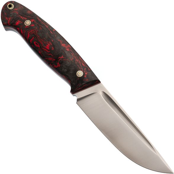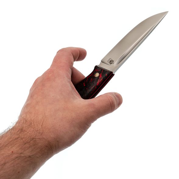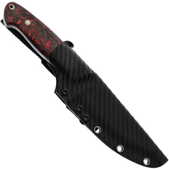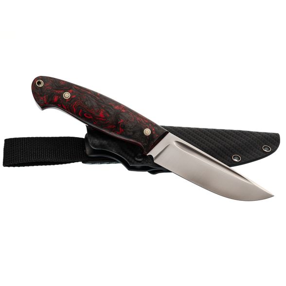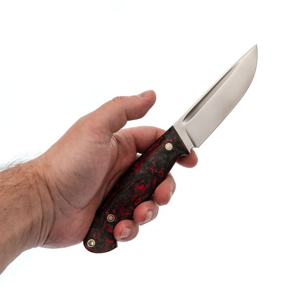 Рукоять, словно произведение искусства, создана для комфорта и контроля. Карбоновые накладки, выполненные в технике накладного монтажа, не только придают ножу уникальный внешний вид, но и обеспечивают невероятную прочность и легкость. Хаотичная текстура карбона завораживает и подчеркивает индивидуальность модели. Рукоять не боится влаги и экстремальных температур, что делает ее идеальной для активного отдыха. Темлячное отверстие позволяет персонализировать нож под ваши предпочтения.