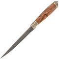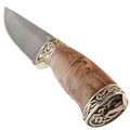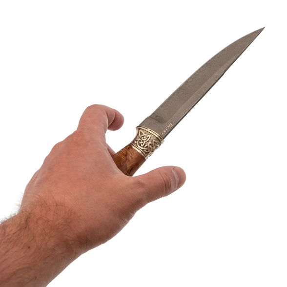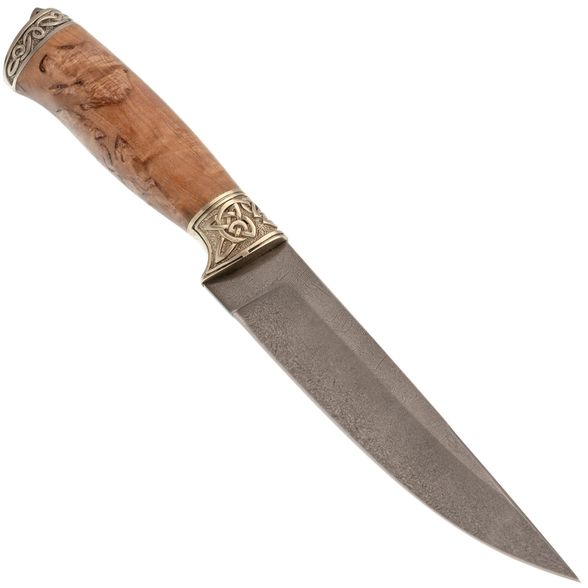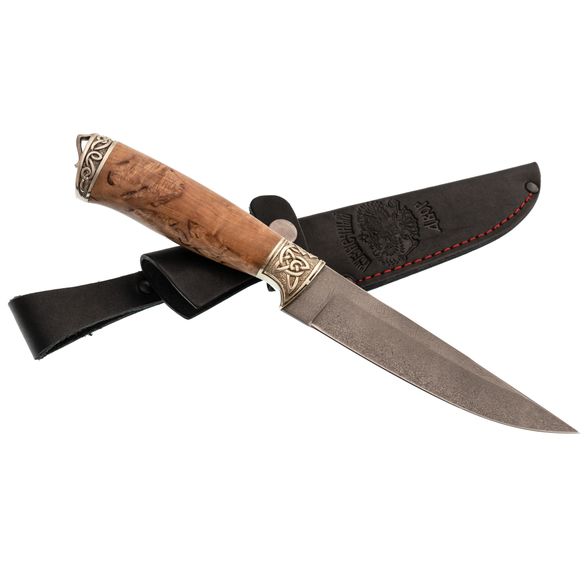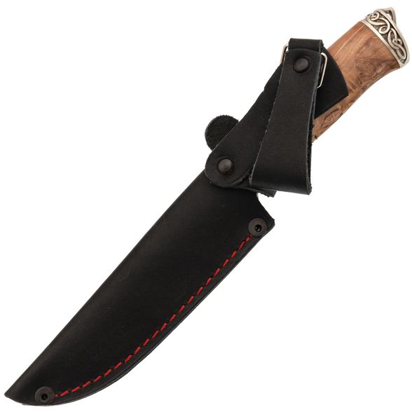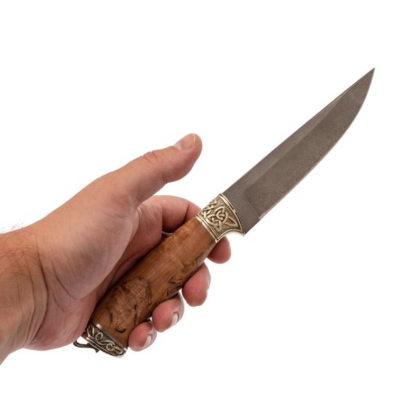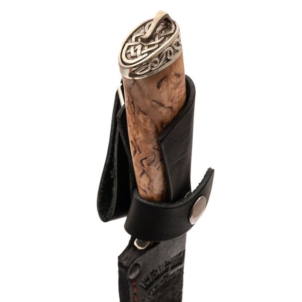 Рукоять изготовлена из красиво стабилизированной карельской берёзы и мельхиора с художественным литьём. Стабилизированная древесина отличается повышенной влагостойкостью и устойчивостью к деформации, что делает рукоять не только красивой, но и практичной. Процесс стабилизации с использованием краски делает текстуру древесины ещё более уникальной и привлекательной.