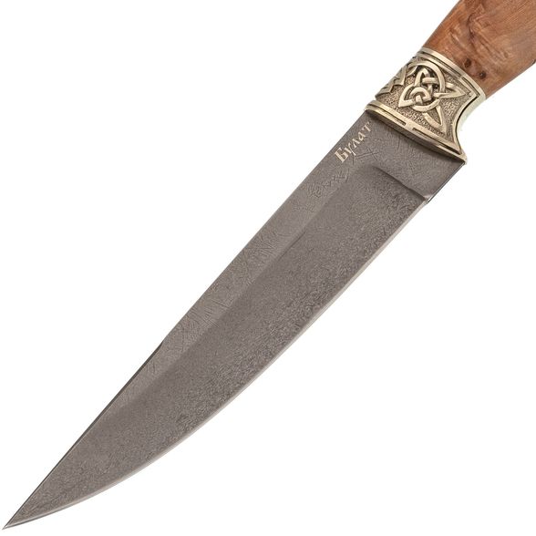 Клинок изготовлен из булатной стали, которая славится своей прочностью и износостойкостью. Булатная сталь обеспечивает идеальный баланс между твердостью и вязкостью, что позволяет долго сохранять остроту и устойчивость к деформации. От середины клинка сделаны спуски, что обеспечивает достаточный запас прочности для туристических задач.