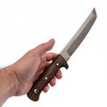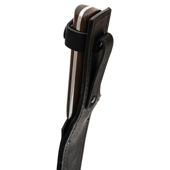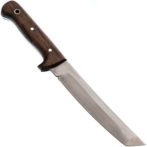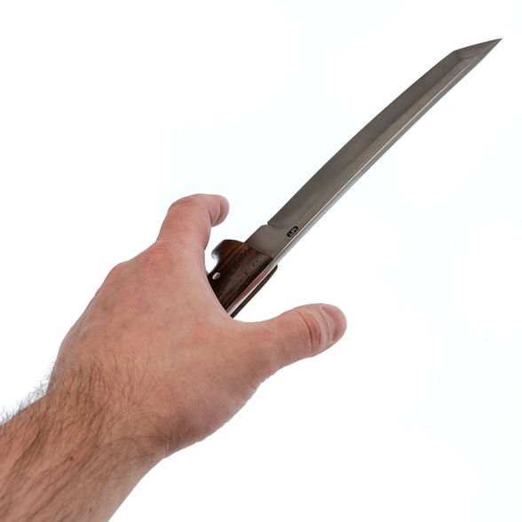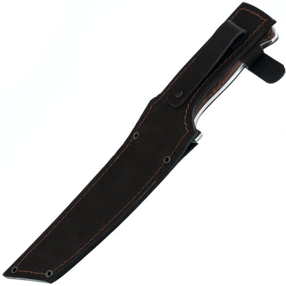 Рукоять из дерева венге надёжна при использовании и защищена от воздействия влаги, моющих средств и других внешних факторов. Клинок поставляется в наборе со стильным темным чехлом, в котором нож будет храниться правильно, поэтому надолго сохранит первозданный вид.