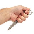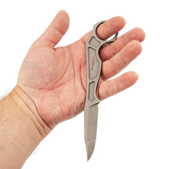 Рукоять выполнена из современных материалов, таких как микарта или G10, которые обеспечивают прочность, комфорт и устойчивость к внешним воздействиям. Дополнительная фрезеровка и выемки под пальцы гарантируют надёжное удержание ножа в любой ситуации. На тыльной стороне рукояти расположено кольцо для фиксации, которое предотвращает выскальзывание ножа из руки.