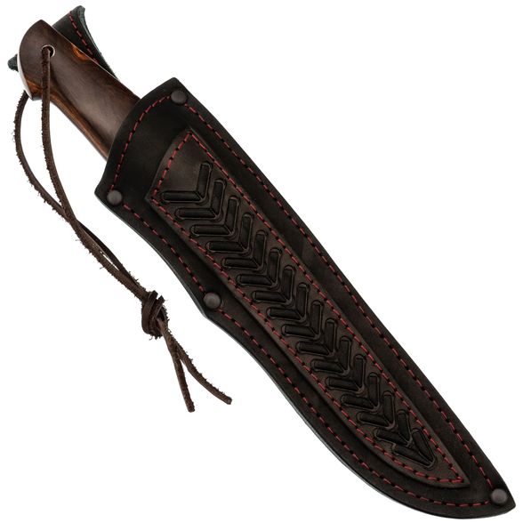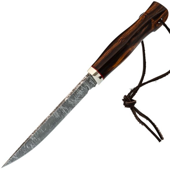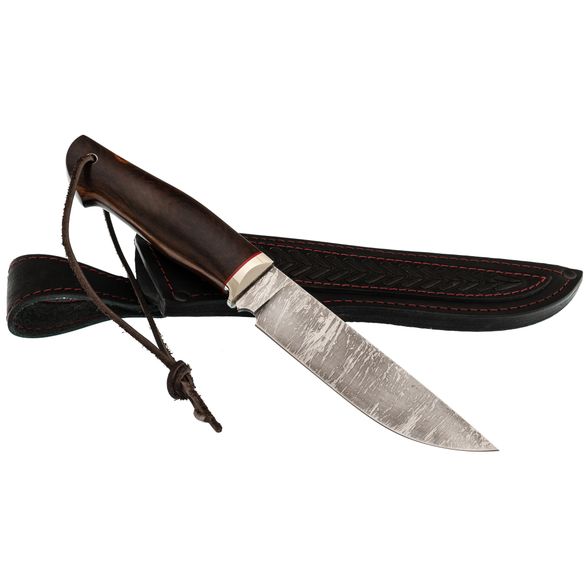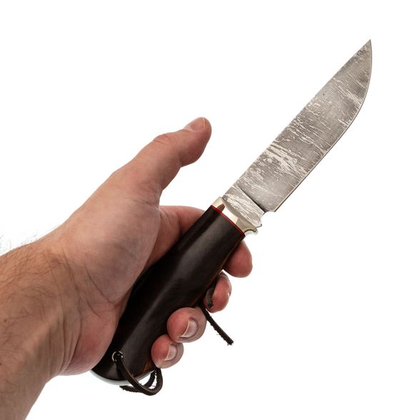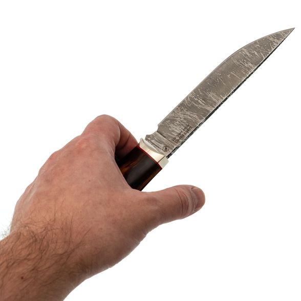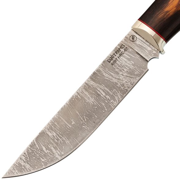 Клинок ножа выполнен из стали A597 — высокоуглеродистой быстрорежущей стали, близкой по свойствам к Р6М5. Она долго сохраняет заточку, обеспечивая эффективное и агрессивное проникновение в разрезаемый материал. Прямые спуски от тонкого обуха гарантируют превосходные режущие и строгательные качества, позволяя выполнять широкий спектр задач. Универсальная форма клинка с прямым обухом удобна для разделки, строгания и других бытовых и охотничьих операций. Дополнительным украшением является красивое травление на клинке, придающее ножу уникальность и подчёркивающее мастерство его создателей.