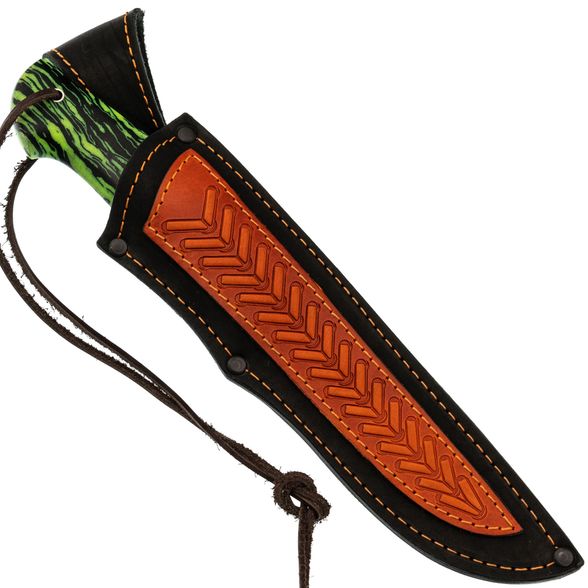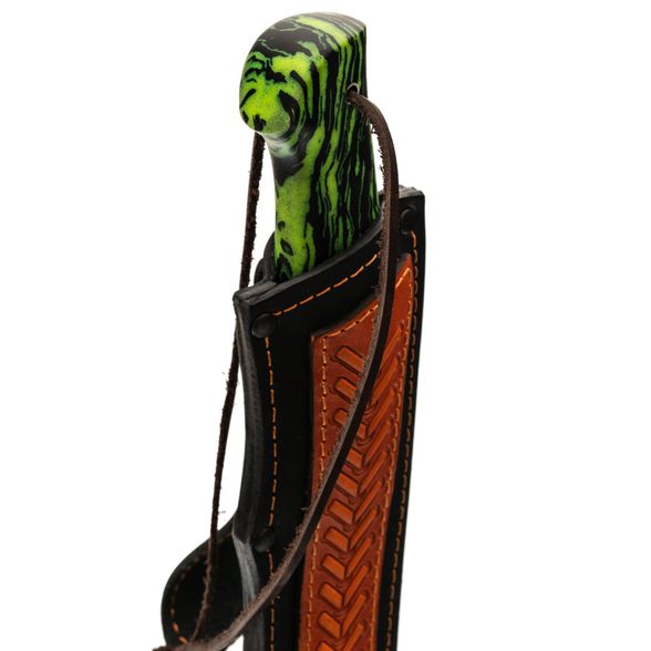 Ножны из натуральной кожи — последний штрих в оформлении этого произведения. Толстая кожа высокого качества гарантирует долговечность, а погружная конструкция обеспечивает надёжную фиксацию ножа. При этом доступ к нему остаётся быстрым и удобным, как и полагается премиальному инструменту. Ножны идеально дополняют общий облик «Тигра», превращая его в сочетание практичности и эстетического удовольствия.