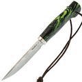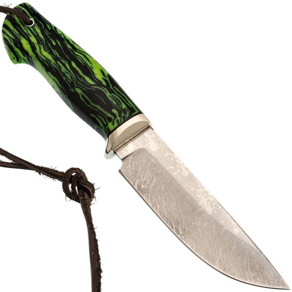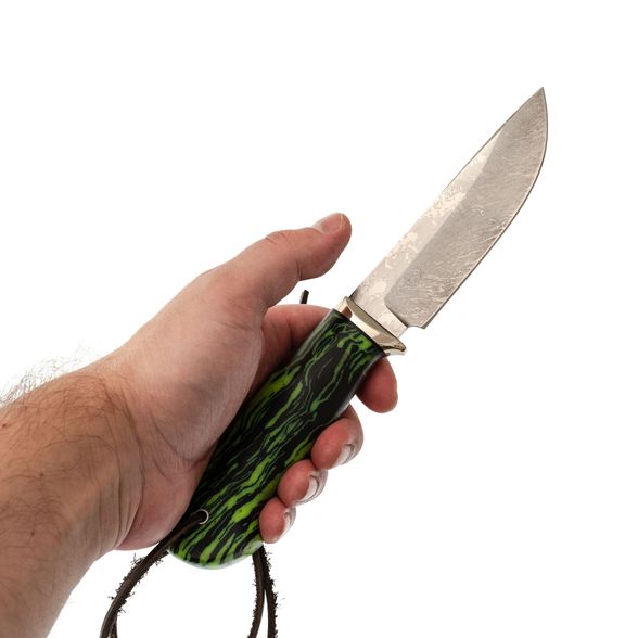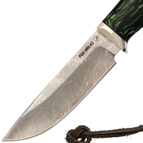 Клинок, выполненный из стали PGK, сочетает в себе эстетику и функциональность. Эта высокоуглеродистая сталь со средним содержанием хрома славится способностью долго удерживать заточку и позволяет затачивать нож на малые углы, достигая идеального реза. Форма Drop-Point с высокими спусками делает нож универсальным и мощным инструментом: он легко справляется с точными резами и тяжёлыми задачами. Травление на клинке не только подчёркивает его уникальный характер, но и защищает металл от коррозии. Однако, как и всякое произведение искусства, клинок требует внимания: лучше избегать длительного контакта с водой, чтобы сохранить его первозданный вид.