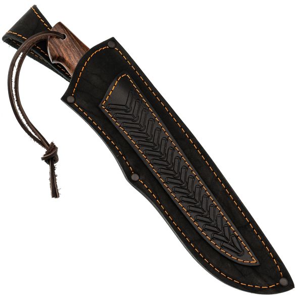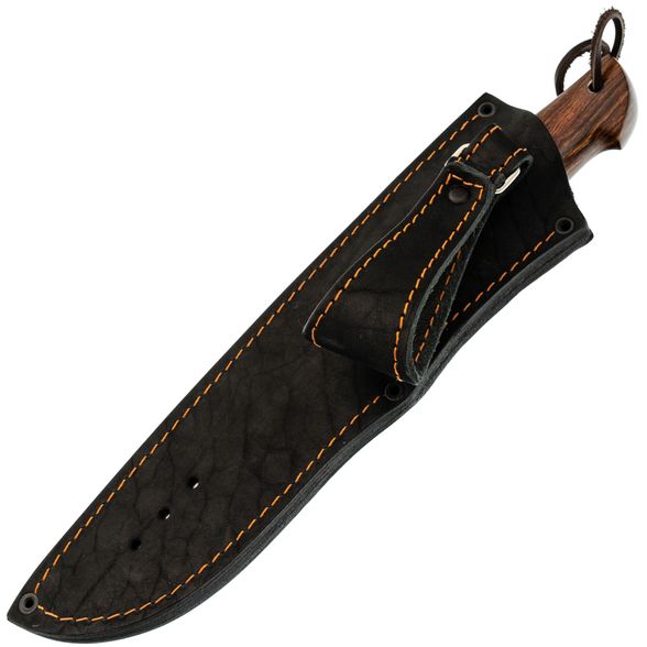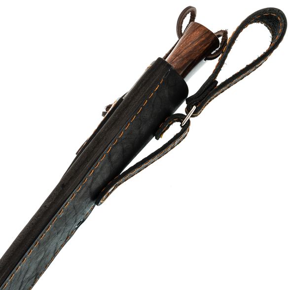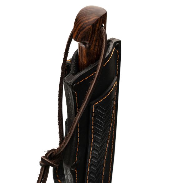 Ножны изготовлены из толстой натуральной кожи, что делает их устойчивыми к износу при правильном уходе. Они имеют свободный и жёсткий подвес, что позволяет выбрать наиболее удобный способ ношения. Погружная конструкция надёжно фиксирует нож внутри, но при этом обеспечивает быстрый доступ при необходимости.