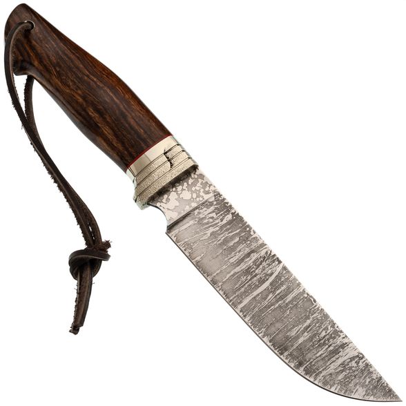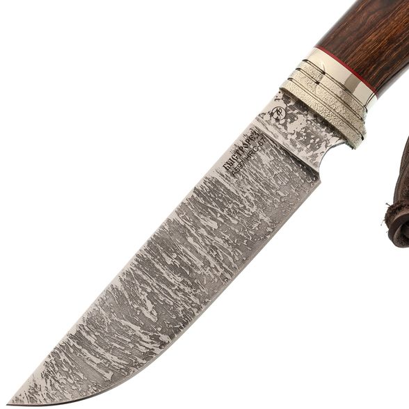 Клинок изготовлен из стали A597 — высокоуглеродистой быстрорежущей стали, схожей по характеристикам с Р6М5. Этот материал обеспечивает длительное удержание заточки и отличную режущую способность. Прямые спуски от тонкого обуха придают клинку превосходные режущие и строгательные характеристики, благодаря чему он идеален для охотичьих нужд.