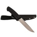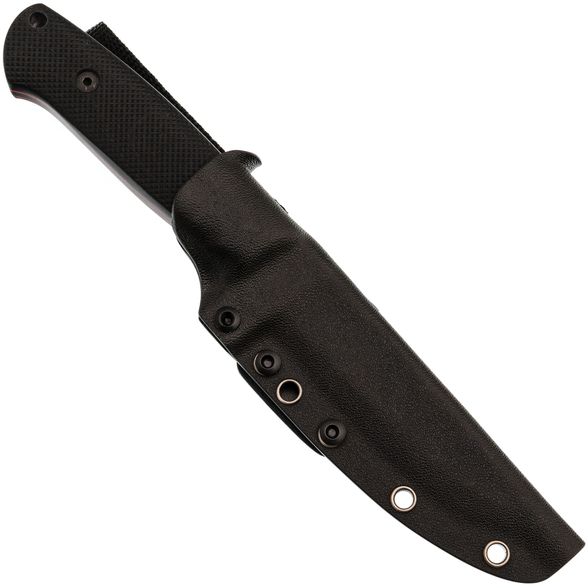Ножны изготовлены из кайдекса, пластика, который обеспечивает идеальную посадку ножа. Нож входит в ножны с характерным щелчком и надежно фиксируется, что исключает его выпадение. Внутри ножен расположен ролик, предотвращающий контакт клинка с пластиком, что сохраняет остроту режущей кромки. Подвес ножен жесткий, со стропой, что обеспечивает удобство ношения и быстрый доступ к ножу.