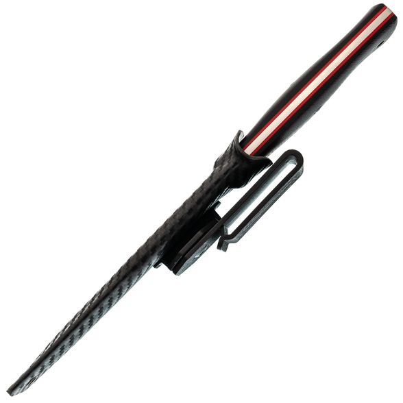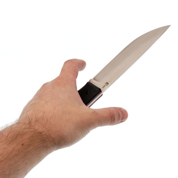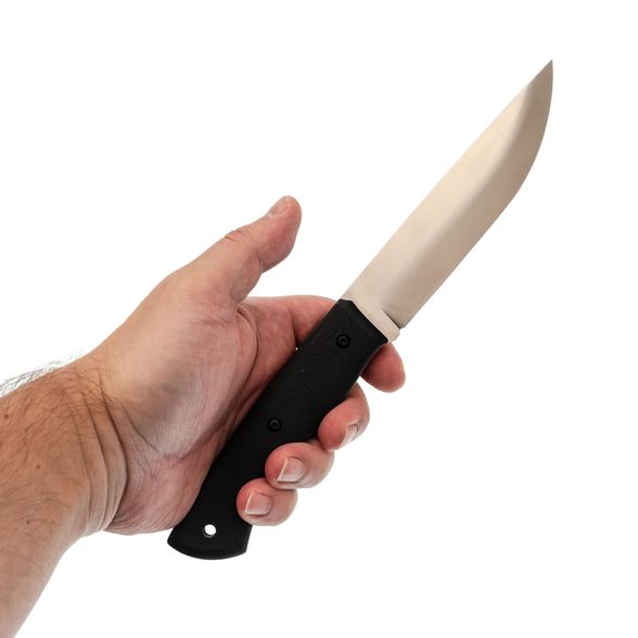 Обводы продуманы так, чтобы ладонь заполнялась полностью: плавный подпальцевый радиус, легкая горбинка сверху, упор под большой палец. Текстурированная G10 не скользит, а баланс смещён к руке - работать комфортно долго.