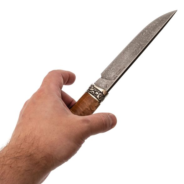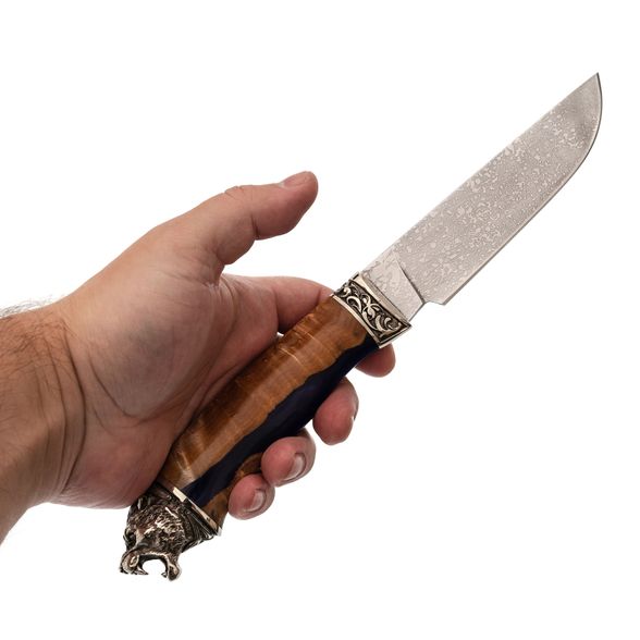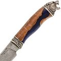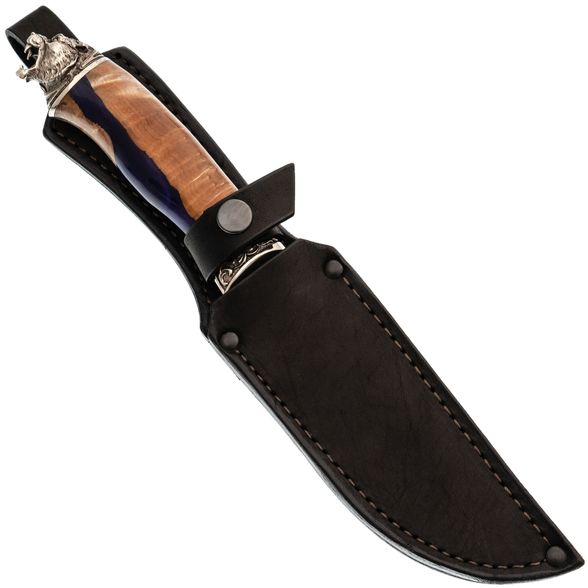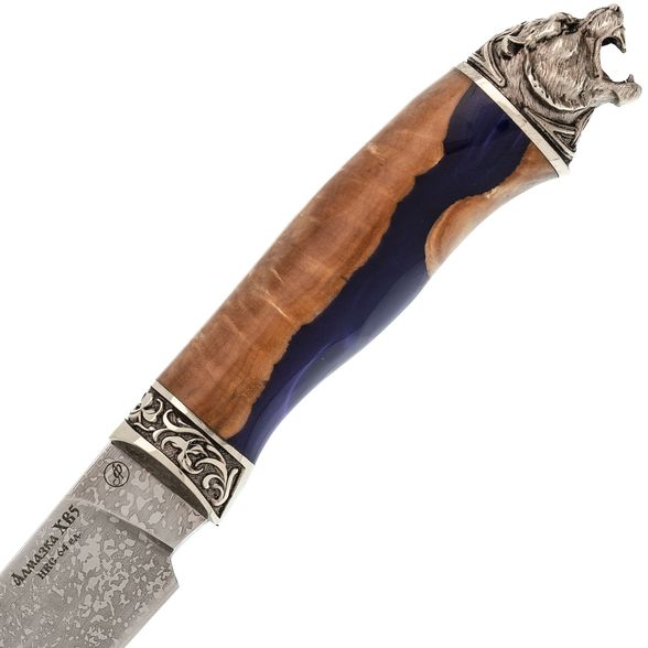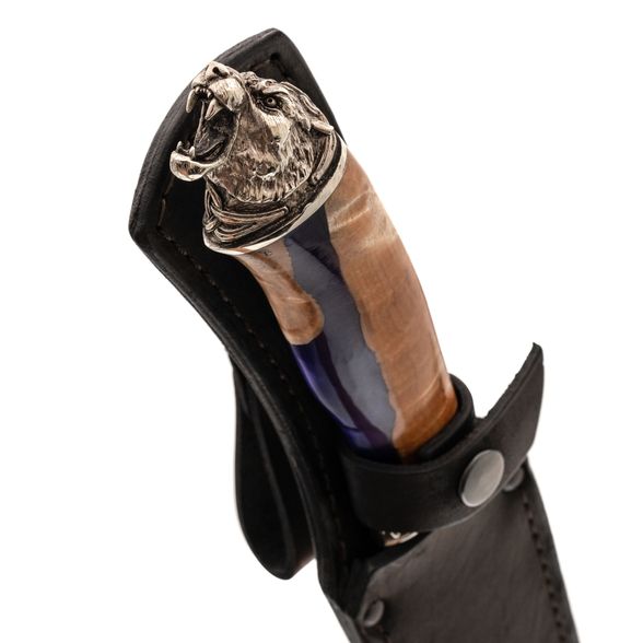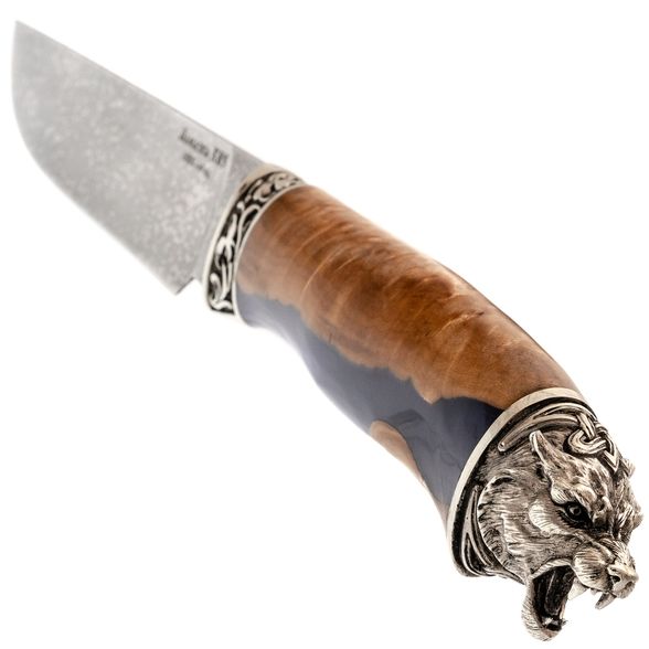 Рукоять изготовлена из стабилизированной карельской берёзы и акрила, что обеспечивает не только потрясающий внешний вид, но и высокую водостойкость. Изгиб и объёмная форма рукояти обеспечивают удобное и надёжное удержание ножа в руке. Художественное литьё с изображением волка подчёркивает твёрдый дух владельца.