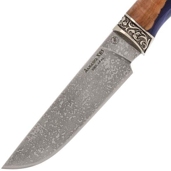 Клинок изготовлен из высококачественной российской стали ХВ5, которая известна своей исключительной твёрдостью и долговечностью. Такая сталь идеально подходит для охотничьих ножей, обеспечивая отличную режущую способность и длительное удержание заточки. Форма клинка типа Drop-Point с прямыми спусками от обуха позволяет выполнять различные задачи на охоте с максимальной эффективностью. Художественное травление на клинке придаёт ему уникальный и запоминающийся вид.