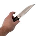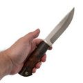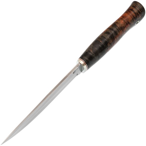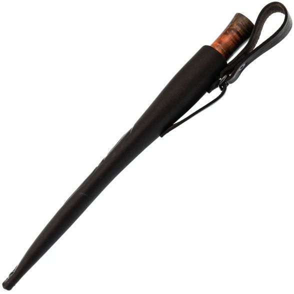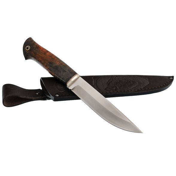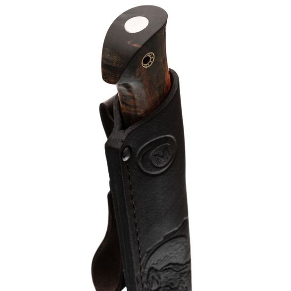Рукоять ножа изготовлена из стабилизированной карельской берёзы, что обеспечивает прочность и устойчивость к воздействию влаги, а также сохраняет природную текстуру дерева. Сквозной монтаж клинка добавляет дополнительную прочность и долговечность. Эргономичная форма рукояти тщательно проработана для комфортного удержания, даже при длительной работе, что предотвращает появление дискомфорта.