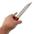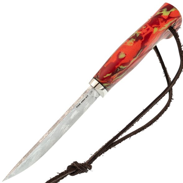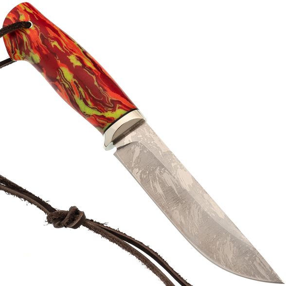 Рукоять изготовлена из слоёной микарты, которая отличается уникальным рисунком, высокой прочностью, лёгкостью и влагостойкостью. Благодаря тщательно выверенной форме и изгибу, рукоять удобно лежит в руке, а её объёмность предотвращает натирание даже при длительной работе ножом.