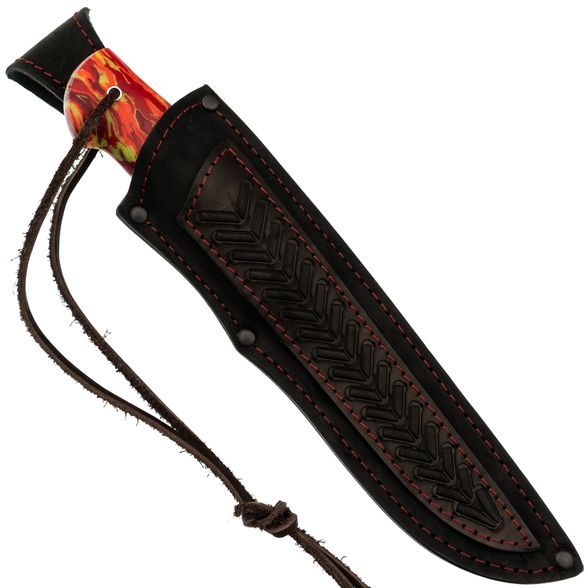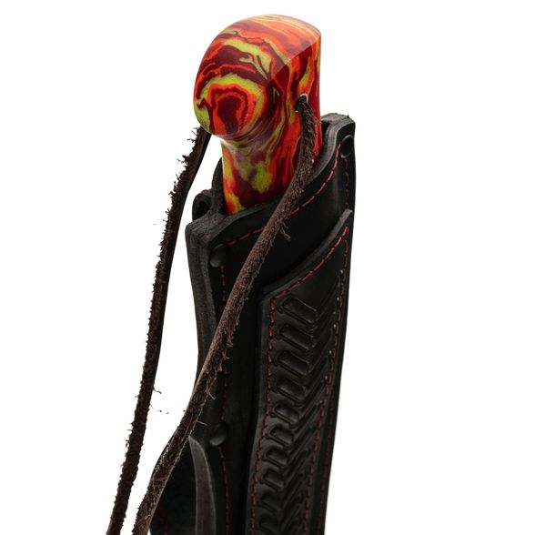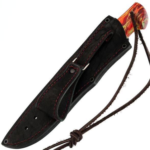 Ножны сделаны из толстой натуральной кожи высокого качества, что обеспечивает их долговечность. Погружное устройство надёжно фиксирует нож внутри, не ограничивая при этом его удобное извлечение. Такая конструкция обеспечивает лёгкий доступ к ножу, что особенно важно в полевых условиях.