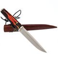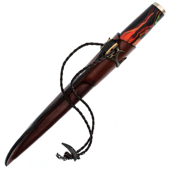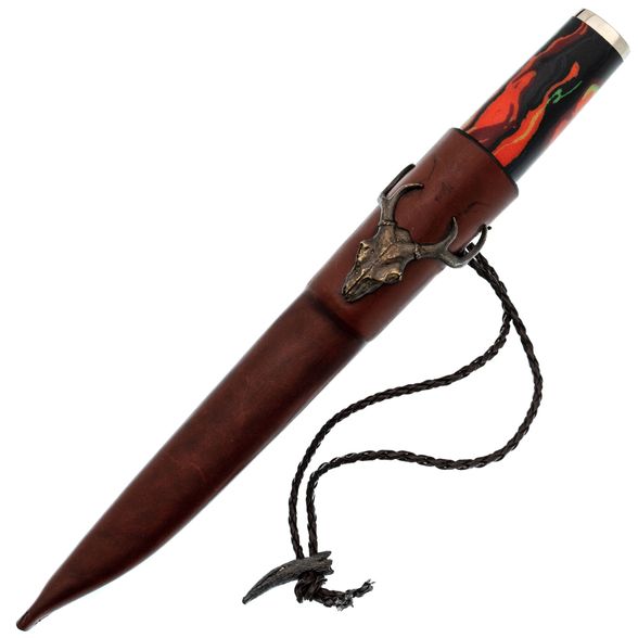 Ножны ножа выполнены в традиционном стиле и точно повторяют форму клинка, что позволяет надежно фиксировать нож в футляре. Декоративные элементы художественного литья, изображающие череп и клык, придают изделию уникальный и запоминающийся вид. Для подвеса используется кожаный шнур, который позволяет ножу свободно двигаться на поясе, не ограничивая мобильность владельца, что особенно удобно во время активного движения.
