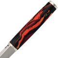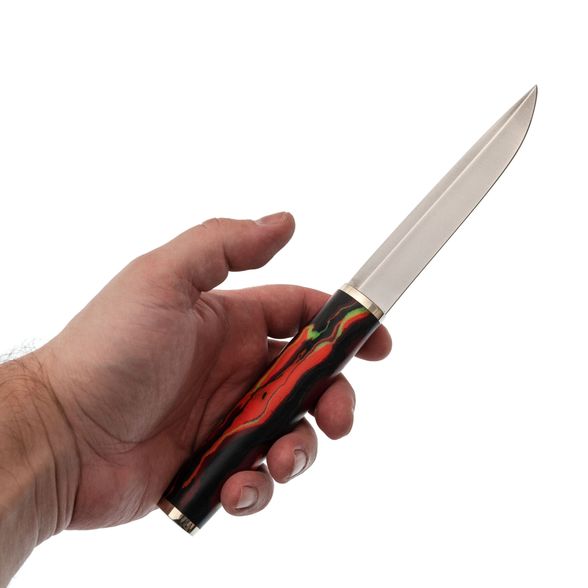 Рукоять ножа изготовлена из слоёной микарты, которая отличается необычным внешним видом и выраженной текстурой, обеспечивающей надежный и цепкий хват даже в условиях повышенной влажности. Этот материал устойчив к внешним воздействиям, включая перепады температуры, влагу и механические нагрузки, что делает нож надежным спутником в любой ситуации. Легкость микарты дополнительно снижает вес ножа, что повышает удобство его использования. Прямая форма рукояти и овальное сечение гарантируют комфортное удержание в руке, а сквозной монтаж обеспечивает высокую прочность и стабильность всей конструкции.