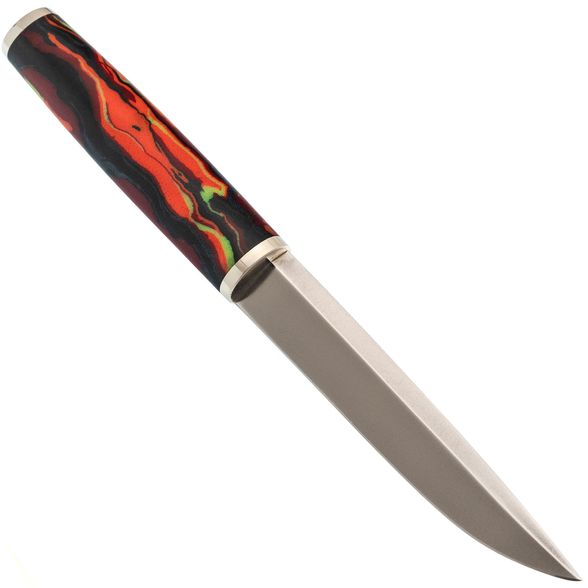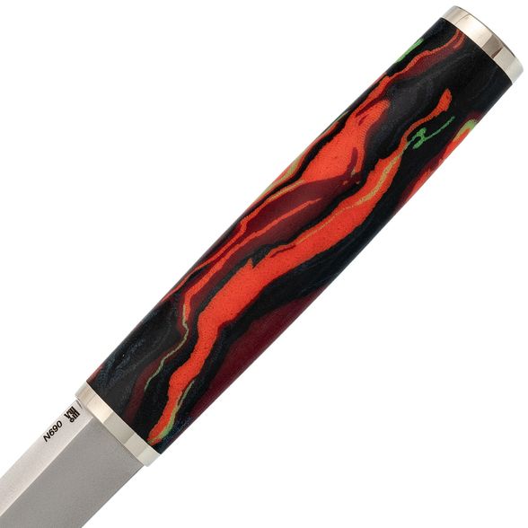 Клинок ножа выполнен из стали N690, которая заслужила репутацию одной из лучших в своем классе благодаря оптимальному соотношению износостойкости и стойкости к коррозии. Этот материал обеспечивает надежную работу ножа в сложных условиях, от разделки дичи до хозяйственно-бытовых задач. Уникальное ромбовидное сечение клинка улучшает режущие характеристики, сохраняя прочность. Дополнительная функциональность заключается в том, что обух ножа можно использовать для скобления, например, для очистки рыбы от чешуи.