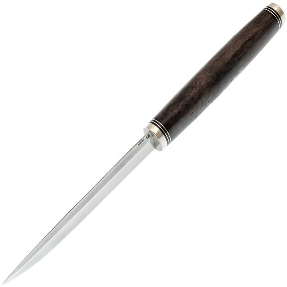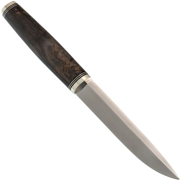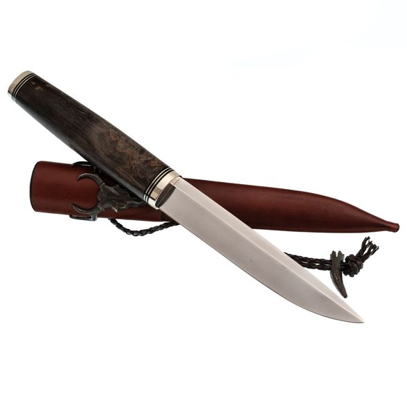 Рукоять изготовлена из стабилизированной карельской берёзы, что придаёт ножу не только эстетическую ценность за счёт выразительной природной текстуры, но и практичность - материал не впитывает влагу и устойчив к температурным перепадам. Овальное в сечении тело рукояти удобно ложится в ладонь, не скользит и не проворачивается при работе. Благодаря хорошо выверенной форме, нож комфортно держится даже в перчатке, что особенно важно в полевых условиях.