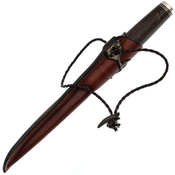 Ножны выполнены из натуральной кожи премиального качества и обладают высокой прочностью, устойчивостью к износу и визуальной привлекательностью. Они изготовлены по классической технологии с формованием по рукояти, благодаря чему нож входит в них с чёткой посадкой и надёжно фиксируется. Особого внимания заслуживает декоративное литьё с изображением черепа и рогов оленя - стильная деталь, подчёркивающая характер изделия. Для подвеса используется кожаный шнурок, позволяющий свободно носить нож на поясе - он не мешает при ходьбе и удобно располагается во время движения.