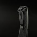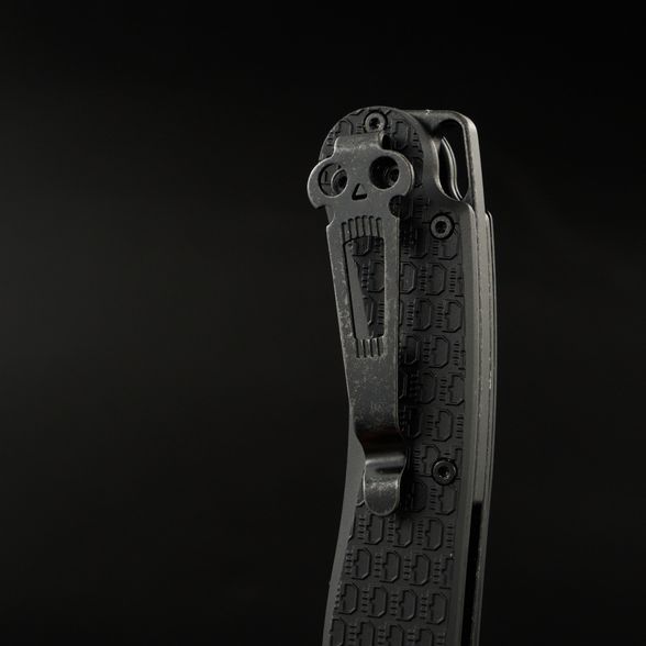 Продуманная геометрия рукояти обеспечивает надёжный и удобный хват. Независимо от того, как долго вы работаете ножом - он не натирает и не выскальзывает. Текстурированная поверхность FRN гарантирует надёжное сцепление даже во влажной среде. Большое отверстие под темляк позволяет использовать паракорд или декоративные аксессуары. Особого внимания заслуживает фирменная переставляемая клипса в виде черепа - не просто элемент дизайна, а функциональный компонент, который удобно крепится и не мешает при работе.