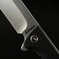 Форма клинка - ярко выраженный clip-point с острым, вытянутым кончиком. Это позволяет выполнять тонкую, точную работу, а также легко входить в материал. Высокие вогнутые спуски формируют тонкое сведение, что даёт эффективный рез с минимальным сопротивлением. Клинок открывается с помощью флиппера, а подшипники в осевом узле делают движение лёгким и быстрым, независимо от того, работаете вы правой или левой рукой.