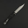 Форма рукояти адаптирована под анатомию ладони. Выраженные изгибы и плавные линии обеспечивают надёжный и контролируемый хват. Текстура накладок выполнена так, чтобы исключить проскальзывание. За счёт глубокой подпальцевой выемки нож фиксируется в руке даже при динамичных движениях. На рукояти предусмотрено большое темлячное отверстие, а клипса в виде черепа не только придаёт характерный стиль, но и позволяет переставить её под нужную сторону - для правши или левши.