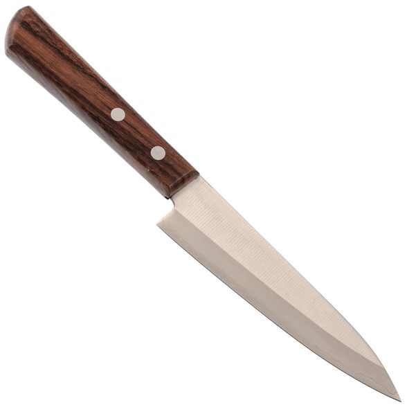 Клинок выполнен из японской нержавеющей стали AUS-8 с внешними обкладками. Такое сочетание обеспечивает ножу хорошую твердость, отличную коррозионную стойкость и длительное удержание заточки. Тонкое сведение и аккуратный спуск позволяют ножу буквально «вплывать» в продукт, обеспечивая чистый и контролируемый рез. Однако за счёт тонкого лезвия он требует аккуратного обращения и не предназначен для работы с замороженными продуктами или костями.