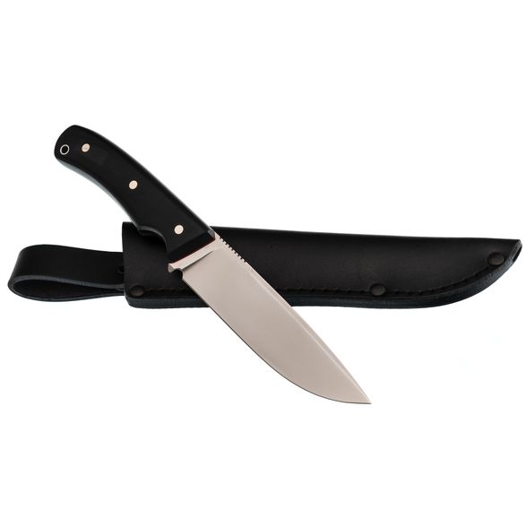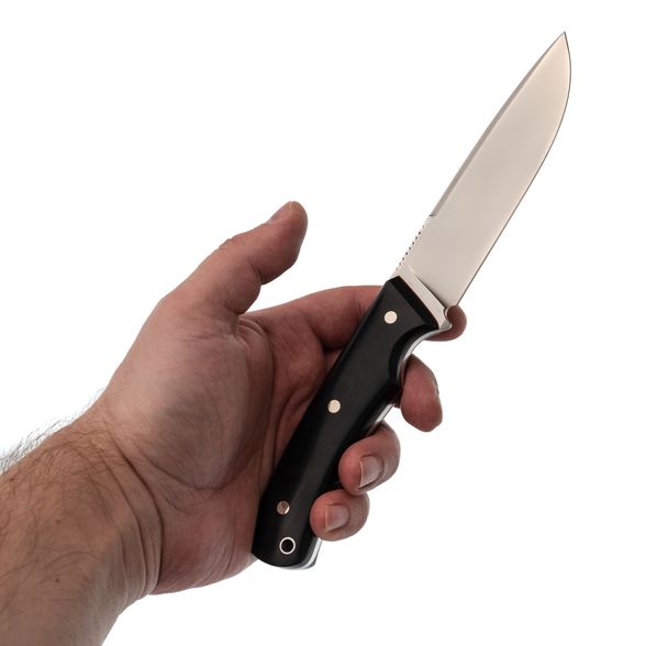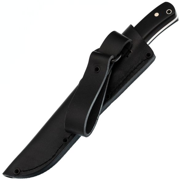 Конструкция рукояти - накладной монтаж (Full-Tang). Это значит, что клинок и хвостовик выполнены из одного цельного куска металла, что обеспечивает исключительную прочность и надёжность конструкции. Накладки из черного G10 - это стеклотекстолит, материал, известный своей влагостойкостью, устойчивостью к перепадам температуры и механическим повреждениям.