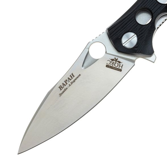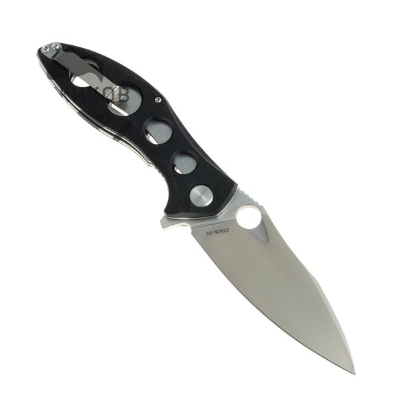 В качестве стали клинка здесь используется американский инструментальный сплав D2, который получил широкое распространение на ножах бюджетного и среднего ценового сегмента за счет своего агрессивного реза и долгого удержания заточки. Широкий клинок и прямые спуски от обуха обеспечивают ножу отличное качество реза.
