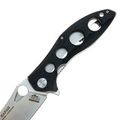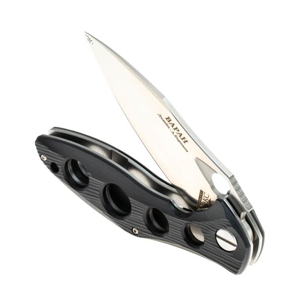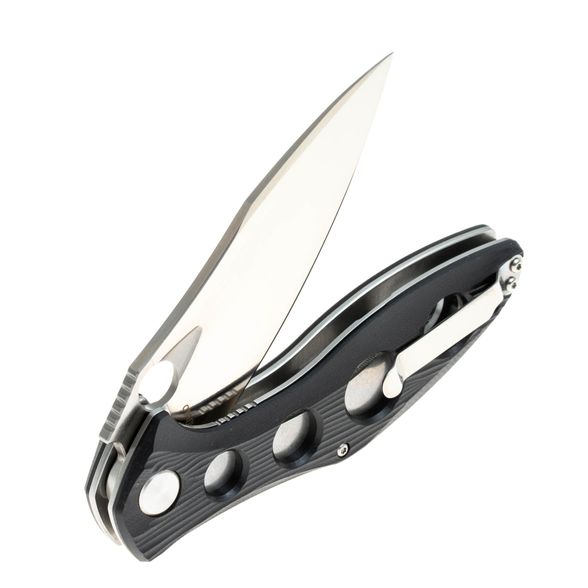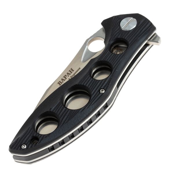 Для приведения ножа в рабочее положение можно использовать либо флиппер, либо удобное отверстие на клинке для упора большого пальца. В рабочем положении флиппер выполняет роль ограничителя для защиты от соскальзывания руки на режущую кромку.