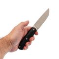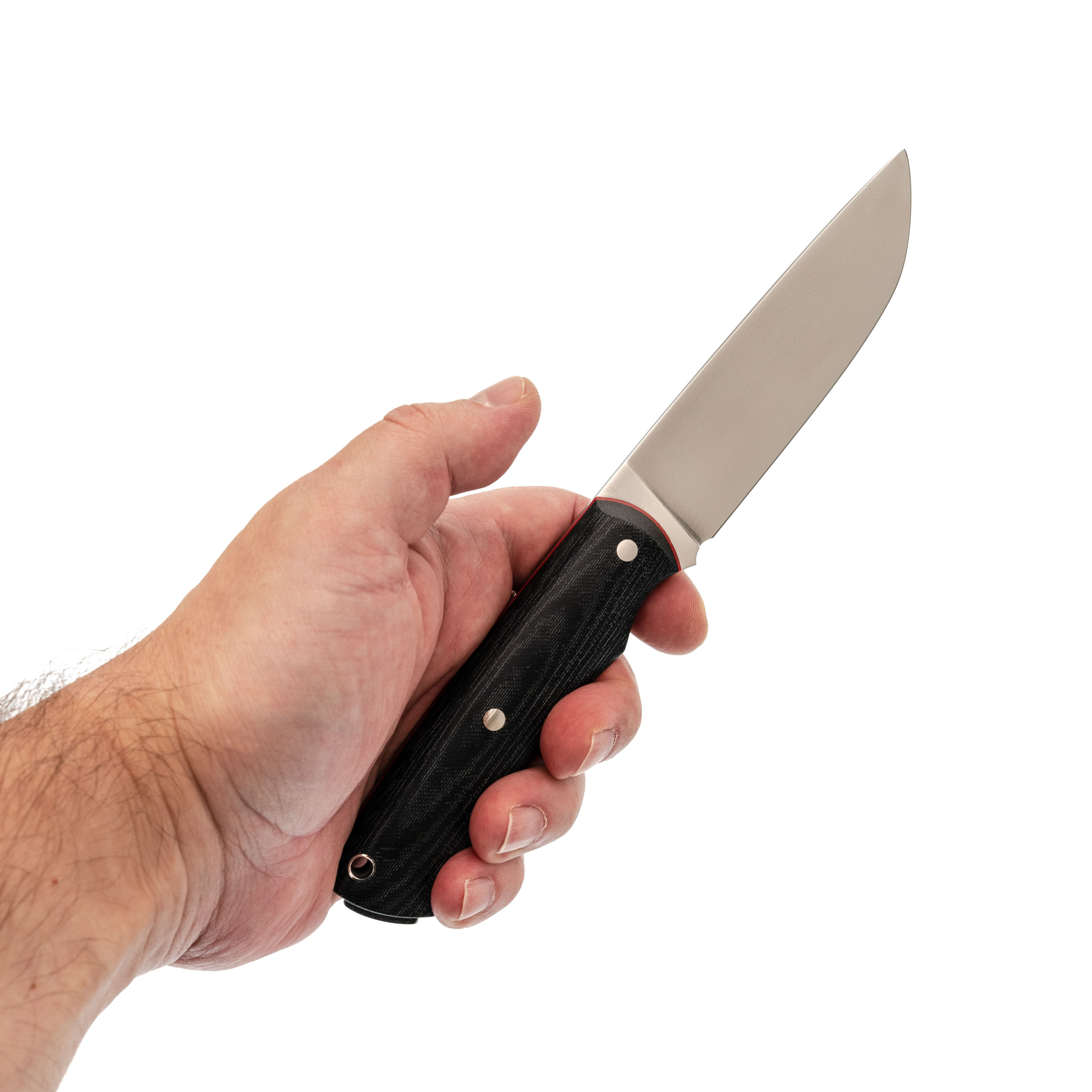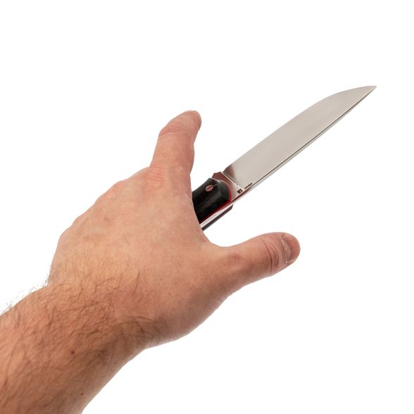 Рукоять изготовлена из карбона и микарты с использованием стеклотекстолита G10, что делает ее легкой, прочной и надежной. Эргономичная форма рукояти обеспечивает комфортное и безопасное удержание. Накладной монтаж рукояти гарантирует высокую прочность и долговечность конструкции.
