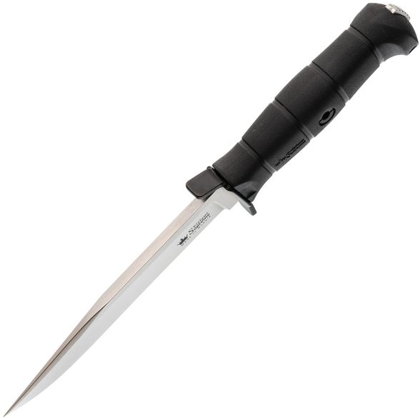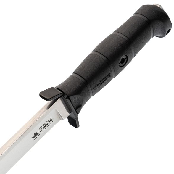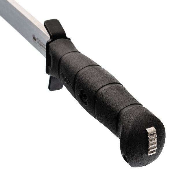 Рукоять ножа тщательно продумана для комфортного и безопасного хвата. Гарда обеспечивает надежную защиту руки, а форма рукояти с грибком гарантирует уверенное удержание даже в сложных условиях. Материал рукояти - кратон, обеспечивает отличное сцепление и устойчивость к воздействию окружающей среды. Этот резиноподобный материал поглощает вибрации и не деформируется при экстремальных температурах. Хвостовик проходит через всю рукоять, образуя выступ на навершии, который можно использовать как ударную поверхность.